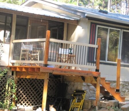 Yes, my new deck and railings got finished Wednesday. Just after this snap, I put in the banister and balusters on the right. Another project report on shopTalk Sunday so jot it down.