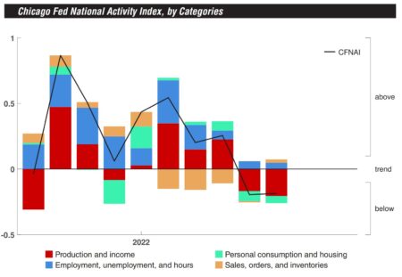 “The Chicago Fed National Activity Index (CFNAI) was unchanged at –0.19 in June. Two of the four broad categories of indicators used to construct the index made negative contributions in June, and two categories deteriorated from May. The index’s three-month moving average, CFNAI-MA3, moved down to –0.04 in June from +0.09 in May.
