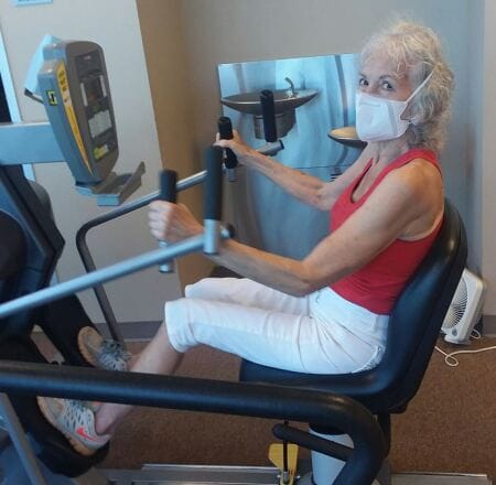 Elaine looks absolutely great! Too bad she’s wearing the mask, but I’m guessing that the PT person was there and that was protocol. I’m also guessing that she never expected you to show up with a camera!