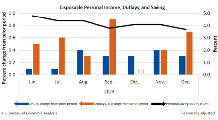 “Personal income increased $60.0 billion (0.3 percent at a monthly rate) in December. Disposable personal income (DPI)—personal income less personal current taxes—increased $51.8 billion (0.3 percent). Personal outlays—the sum of personal consumption expenditures (PCE), personal interest payments, and personal current transfer payments—increased $134.7 billion (0.7 percent) and consumer spending increased $133.9 billion (0.7 percent). Personal saving was $766.7 billion and the personal saving rate—personal saving as a percentage of disposable personal income—was 3.7 percent in December.