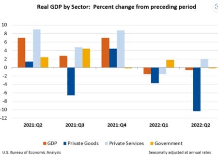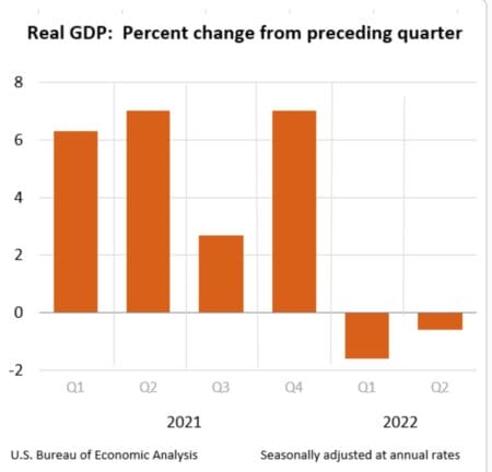 “Real gross domestic product (GDP) decreased at an annual rate of 0.6 percent in the second quarter of 2022, following a decrease of 1.6 percent in the first quarter. The second-quarter decrease was the same as previously estimated in the “second” estimate released in August. The smaller decrease in the second quarter, compared to the first quarter, reflected an upturn in exports and an acceleration in consumer spending.