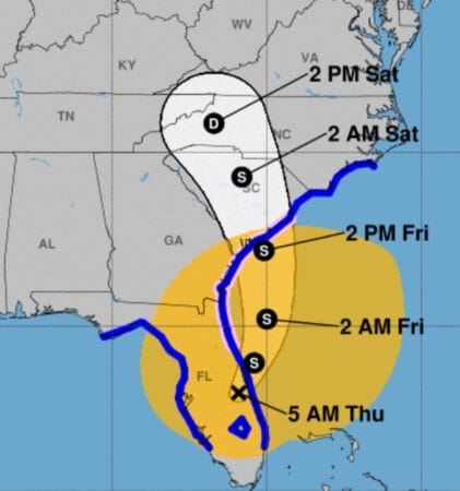 By the look of this (press time) tracking maps from the National Hurricane Center, Ian will swing into the ocean and miss the inland area of the Georgia-Florida line where our pals are. Not too much damage likely in Orlando, either. Not like the southern part of the state where more than 2-million are in the dark today.