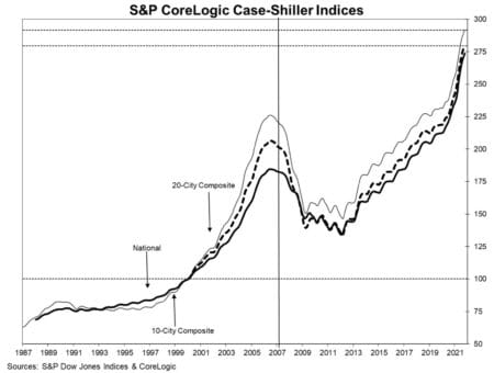 The S&P CoreLogic Case-Shiller U.S. National Home Price NSA Index, covering all nine U.S. census divisions, reported a 19.1% annual gain in October, down from 19.7% in the previous month. The 10- City Composite annual increase came in at 17.1%, down from 17.9% in the previous month. The 20- City Composite posted an 18.4% year-over-year gain, down from 19.1% in the previous month.