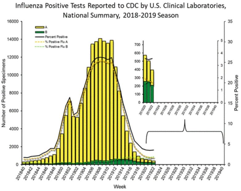 Now make a mental note: 2019-2020 “flu season” SHOWED 22,000 CASES PER WEEK of Flu A PLUS 11,000 a week of Flu B. On that week, looks to us like 27,000 influenza cases peak week.