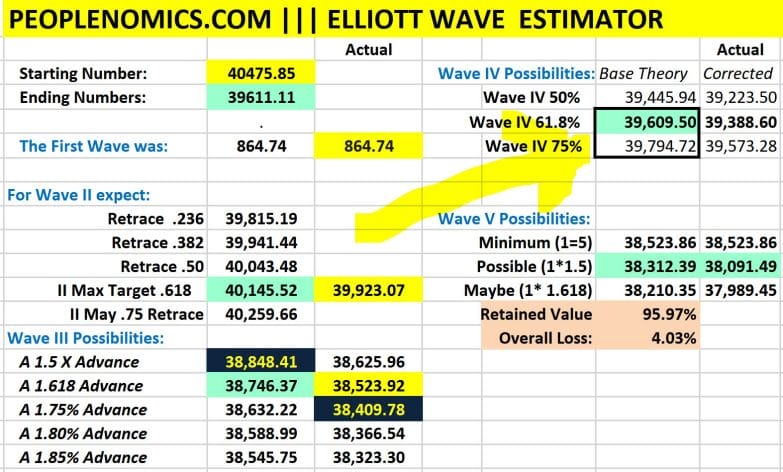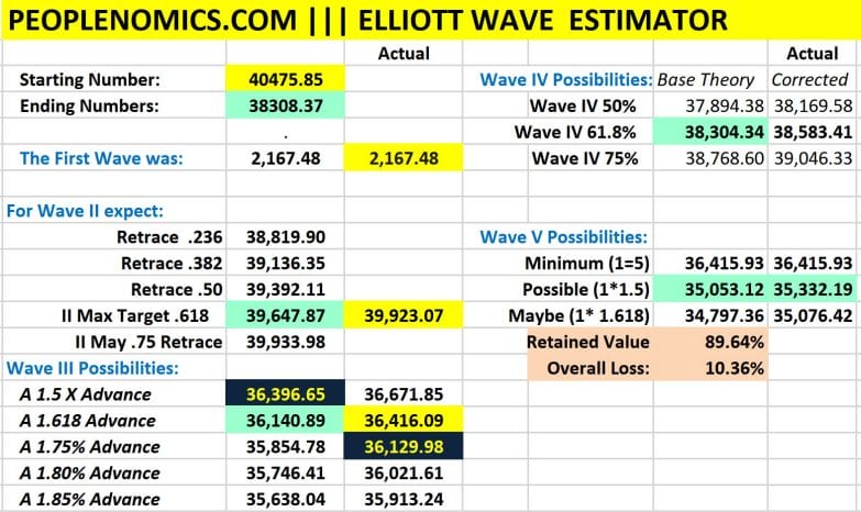 How low could be be at the bottom of this Wave 4 by the end of October? Well, to get that estimate, we take the 5th wave low now projected – assume we get there next week, or so. (Maybe a terribly disappointing Housing report next Tuesday? Must have a scapegoat, right?) Here’s where we could go. Assuming we get down to the 38,308 level over the next 10-days, or less.