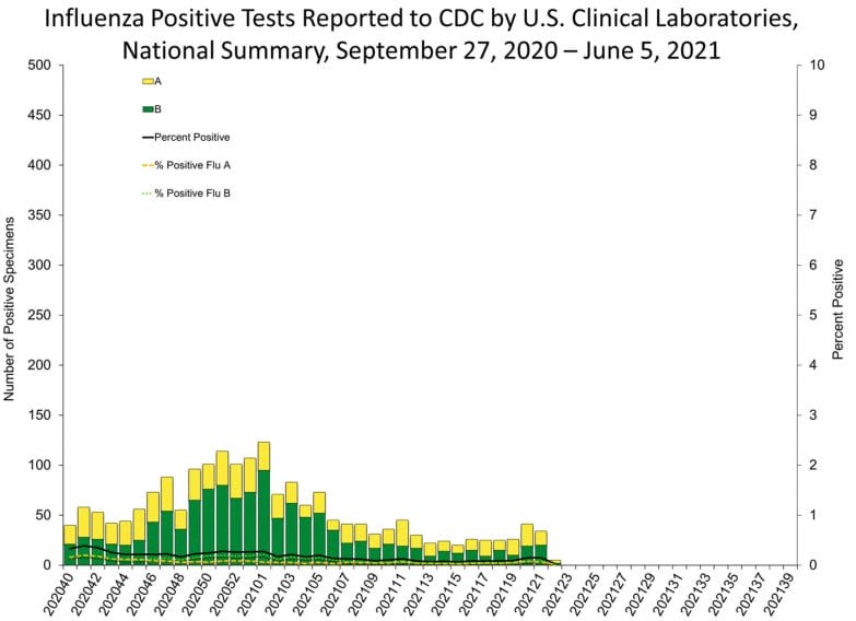 How does CDC reconcile a reduction of Influenza (both types) from a peak of approximately 27.000 weekly cases in 2019-2020 to a weekly peak of approximately 225 cases this year?