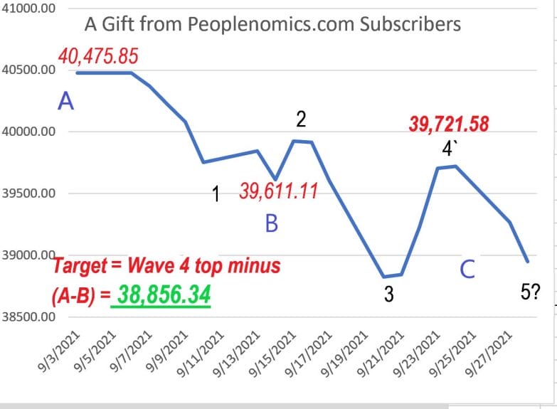 Wave 5 must (under Elliott) be larger than Wave 1 down. Ergo this is a minimum downside for our Aggregate Index. Which closed Monday at 39,267.33. Playable decline due.