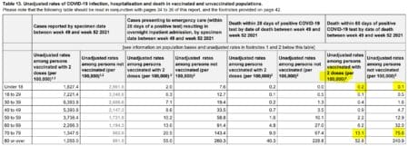 As you can see in the lower pair of highlights, the risk of death appears to be 5.77 times higher for Elaine and me (70-79 and unvaxxed) versus our odds of dying with the vax.