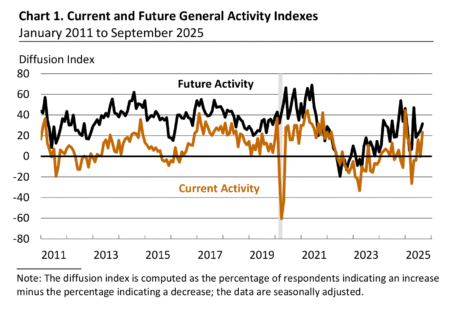 “The diffusion index for current general activity rose 24 points to 23.2 in September, its highest reading since January (see Chart 1). Almost 40 percent of the firms reported increases in general activity this month (up from 30 percent last month), while 17 percent reported decreases (down from 30 percent); 43 percent reported no change (up from 36 percent). The new orders index rose 14 points to 12.4 this month, and the shipments index rose 22 points to 26.1.”