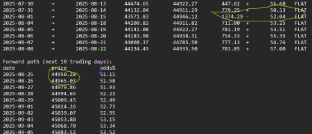 Two things in this run reveal an important fact of “trading” for real money. On the upper right there is a scrawled circle with a lone (-) in it. This hints that within modeling conditions, a move to the short side was indicated around August 15th.