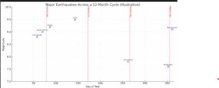 If this reasoning is sound, then earthquake records ought to show four semi-clusters through the year. First, the great quakes that occur near solstices, when the crust is under maximum angular displacement and static load. Banda Aceh in December is a prime example. Second, the rapid-change quakes that occur near equinoxes, when stresses are re-aligning at maximum speed. The big Japan quake struck in March and is the classic case.