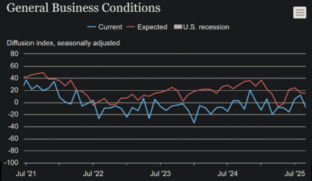 ” The headline general business conditions index dropped twenty-one points to -8.7, its first negative reading since June. New orders and shipments fell sharply. Delivery times were steady, and supply availability worsened somewhat. Inventories edged lower for a second consecutive month. Employment held steady, while the average workweek declined modestly. The pace of input price increases was still elevated, though slower than last month.”
