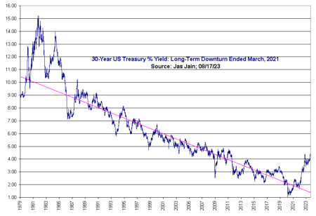 30-Year Treasury yield peaked in September 1981, i.e., bond prices bottomed and the Long-Term bull market in bond prices began. Eleven months later, the Long-Term bull market in stocks began that most likely ended at the end of 2021.