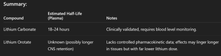 Let me Emphasize again this Important Distinction: Half-life typically refers to plasma clearance, but what matters for mood or neurological effects may be how long lithium remains bioactive in the brain, which could differ between these forms. Without large-scale studies, most claims about lithium orotate’s extended “effective half-life” remain theoretical.