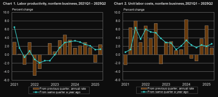 Nonfarm business sector labor productivity increased 2.4 percent in the second quarter of 2025, the U.S. Bureau of Labor Statistics reported today, as output increased 3.7 percent and hours worked increased 1.3 percent. (All quarterly percent changes in this release are seasonally adjusted annualized rates.) From the same quarter a year ago, nonfarm business sector labor productivity increased 1.3 percent in the second quarter of 2025.