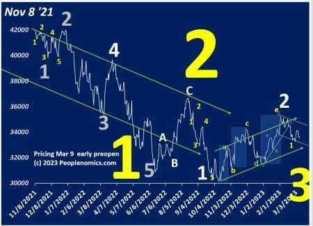 Both SVB and the Russell 2000, the latter laden with Zombie companies and unable to turn a profit sufficient to even repay the interest on outstanding debt, had nonlinearity today. You related SVB’s conclusion and the Russell gapped down. US equities appear to following a 13 October 2022 nadir valuation: x/2-2.5x/2-2.5x/1.5x terminal fractal series of 16/38/35/16 of 24 days. The lower high valuation of the third 35 day third fractal was on 16 February 2023.