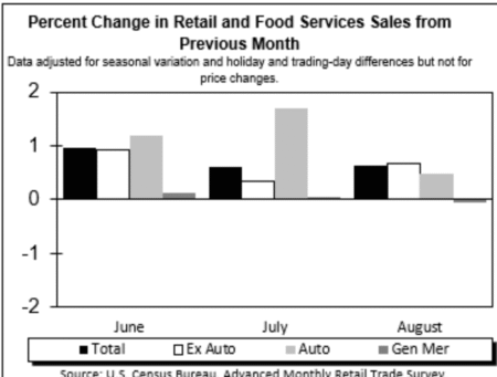 Advance estimates of U.S. retail and food services sales for August 2025, adjusted for seasonal variation and holiday and trading-day differences, but not for price changes, were $732.0 billion, up 0.6 percent (±0.4 percent) from the previous month, and up 5.0 percent (±0.5 percent) from August 2024. Total sales for the June 2025 through August 2025 period were up 4.5 percent (±0.4 percent) from the same period a year ago. The June 2025 to July 2025 percent change was revised from up 0.5 percent (±0.4 percent) to up 0.6 percent (±0.2 percent).”