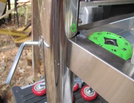 Oh – Elaine wasn’t as keen on my other kitchen tool table suggestion: I proposed we install an 8-inch mechanics vise on the table too. You know, to hold meat (say a ham bone) you’re trimming… Still, I was going better than the Dodgers.