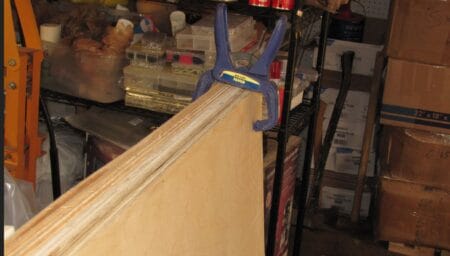 Next trick is to have materials spaced off the floor. If you leave 4-feet (6′ is better) at one end, then when you need material for a project, you slide out the victim plywood onto a conveniently (not put away) paint can… Engineered Laziness! By God, that’s a business model, ain’t it?