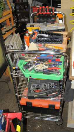 - At the main bench, there’s a roll-around full of tools. Wire rack on big wheels.