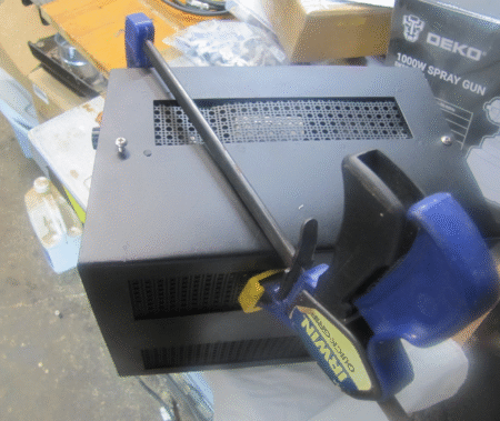 After the ultra tough black satin paint dried (blazing Sun helps)it was time to put the screws back in. which, of course, never line up. So, a trick is to use a soft-jawed squeeze clamp to hold things in place while the low (and in this case, inept) human can get all the screws started…