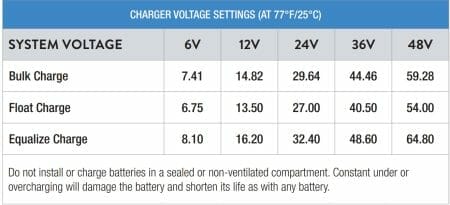 I’ll direct you to the first page of the T-105 spec sheet next. For there, you will see recommended charging voltages for the general type. Pay attention to the voltages because when using liquid cells, they are important.
