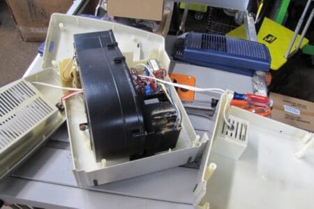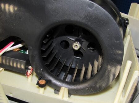 But the last straw was discovered, sinking the project, when I grabbed hold of the very night squirrel cage blower and gave it a gentle turn. Then harder…then finally it budged – barely. These things ought to spin with even a good blowing on ’em. Death by worn bearings…