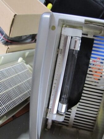 Didn’t look too intimidating: There was a circuit board, a fan housing, and inside this compartment, a 3-inch long germicidal lamp over there on the right….