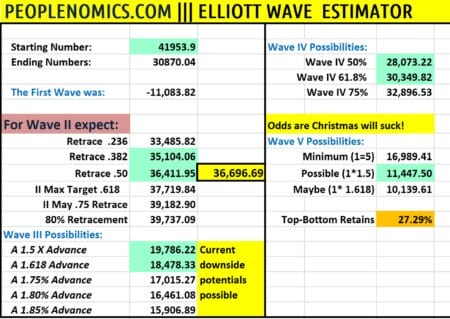 Go back to the chart (above this table) and follow the green line from the bottom of our proposed Wave 5 over to the left. That’s a kind of “real good case” outcome. As you can see, with a low under 16,000 in our proprietary Aggregate Index (truth telling on markets) things could be much worse.